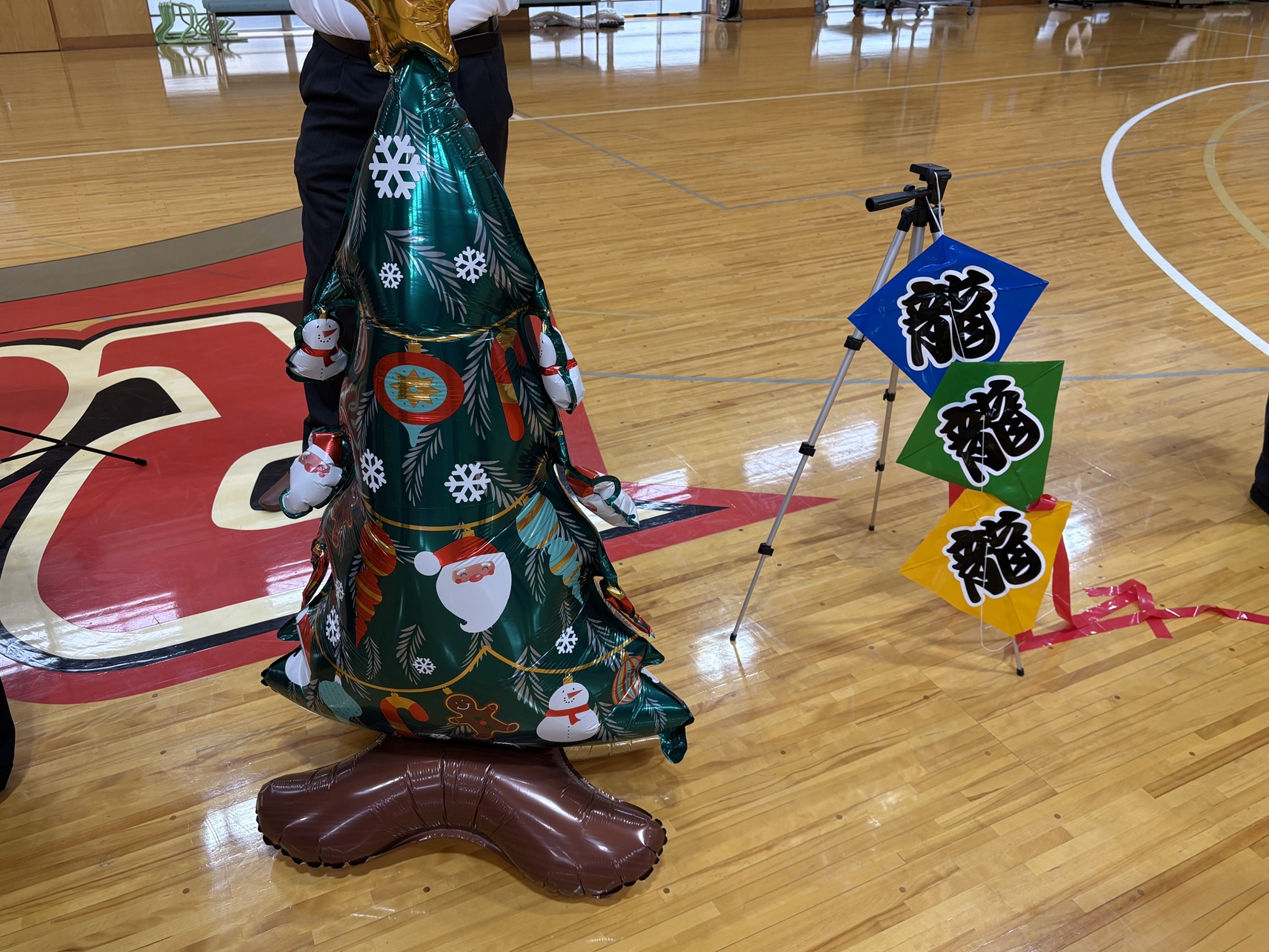 全員の衣装だけでなく、今年は大きなビニール製のクリスマスツリー2つを用意、またリボンのついたプレゼントの箱や大きな靴下、キラキラしたモール、そしてお正月の歌も歌うことから、凧も登場しました。