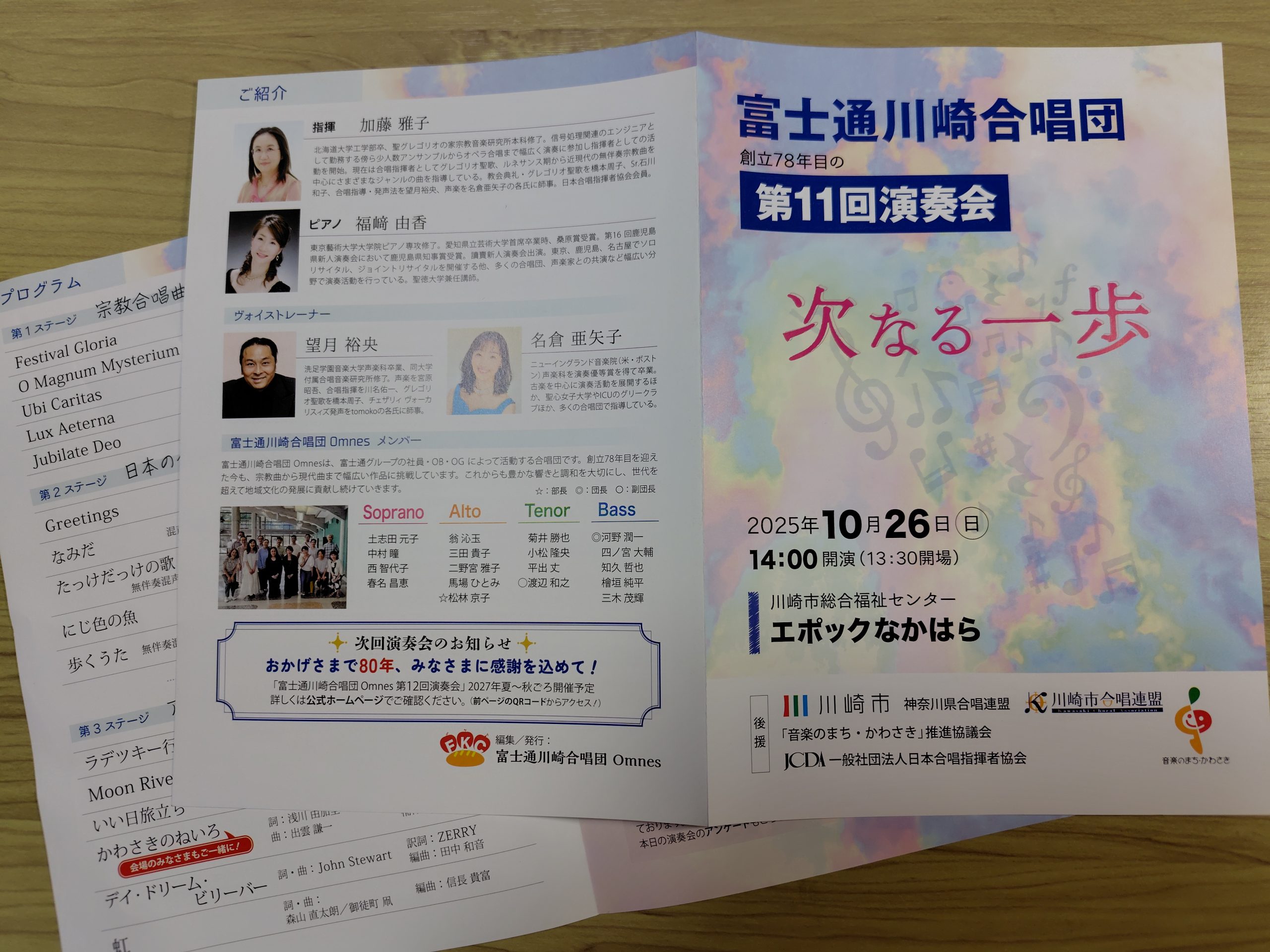 2025年10月26日に開催いたしました富士通川崎合唱団 第11回演奏会は、多くの皆さまにご来場いただき、盛会のうちに無事終演いたしました。